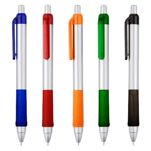 Bolígrafo plástico «Praxis» con cuerpo plateado, grip y clip de color traslúcido. Escritura azul.