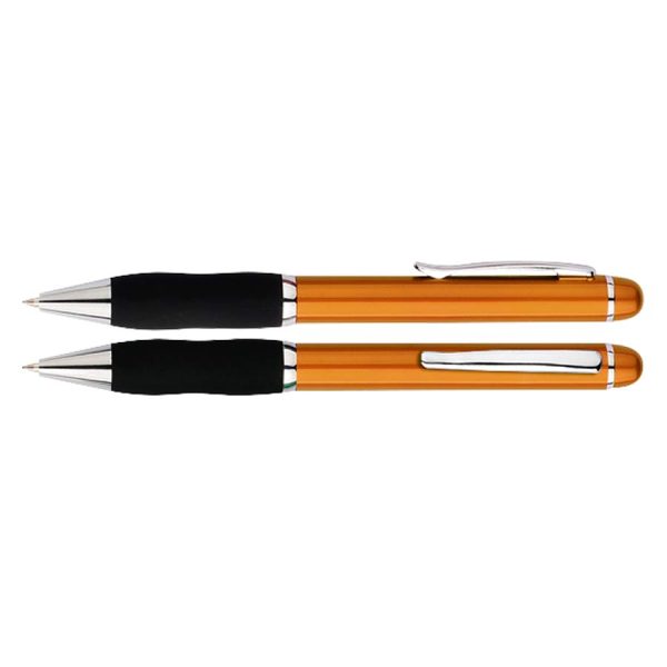 Bolígrafo plástico «Qasar» con cuerpo de color metalizado. Escritura azul.