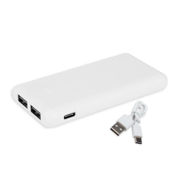 Cargador Power Bank USB portátil plástico ABS blanco, con indicador de carga y doble salida USB. Capacidad 5000mAh. Entrada DC 5V/2A, salida DC 5V/2A. Incluye cable USB/Type C. Batería recargable incorporada. Presentación en caja de regalo de cartulina blanca con colgador para ganchera .
