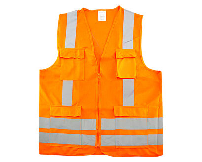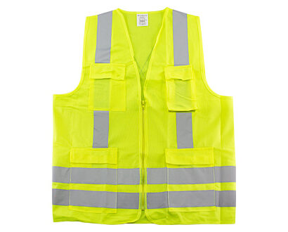 Chaleco Reflectante de Seguridad modelo «Supervisor», 100% tela poliéster 120 g/m2 fluorescente con bandas reflectantes color plateado de 5 cm. de ancho. Incluye 4 bolsillos y cierre-eclair. Cumple con norma legal vigente EN 471.