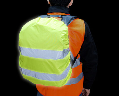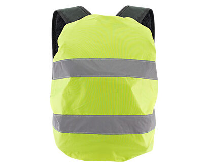 Funda cobertora para Mochila. En tela poliéster 210D/PU impermeable. Incluye 2 bandas reflectantes de 5cm de alto c/u + banda elasticada posterior para ajuste a mochila.