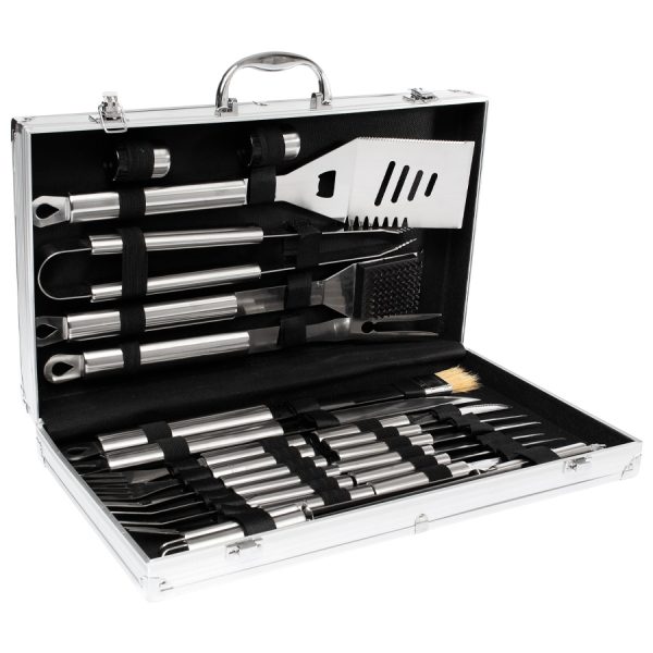 Deluxe BBQ set de asado en caja metálica. Incluye 24 herramientas de asado 100% acero inoxidable. Interior recubierto en tela ecológica negra. Manilla y cierres metálicos. Incluye placa metálica rectangular para grabar logo. Presentación bubble-bag.