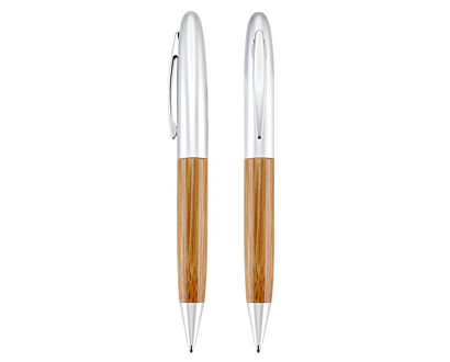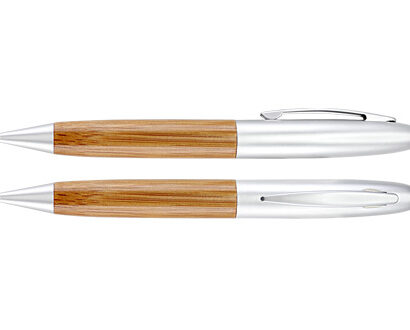 Deluxe Bolígrafo Ejecutivo de Madera de Bamboo con cuerpo superior y clip metálicos satinados, tinta azul.