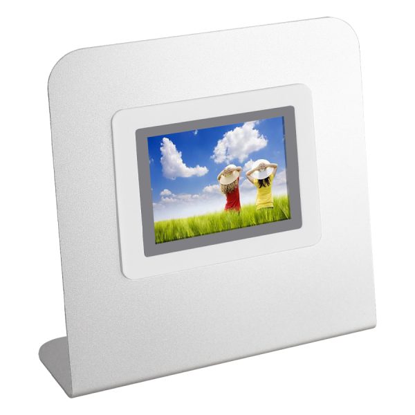 Estación Digital Porta-Fotos con marco metálico autosustentable, pantalla LCD 2.4″ desmontable. Multi-idioma con Reloj, Alarma y Calendario. Memoria interna de 8MB. Incluye batería de litio de 3.7V-180MAH y fuente USB/Mini-USB 5V.