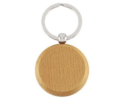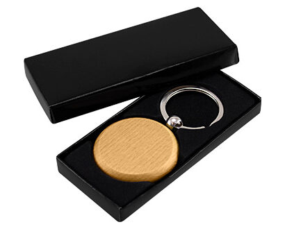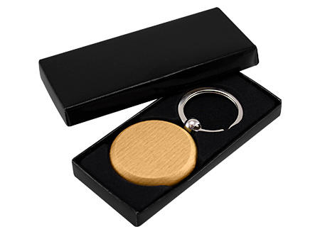 Llavero Redondo de Madera de Bamboo. Presentación en estuche laminado negro con cuna aterciopelada.