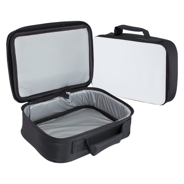 Lonchera de Microfibra, con interior cooler con aislante térmico plateado. Incluye mango y tapa dura en tela blanca para Sublimación a todo color. Cierre eclair.