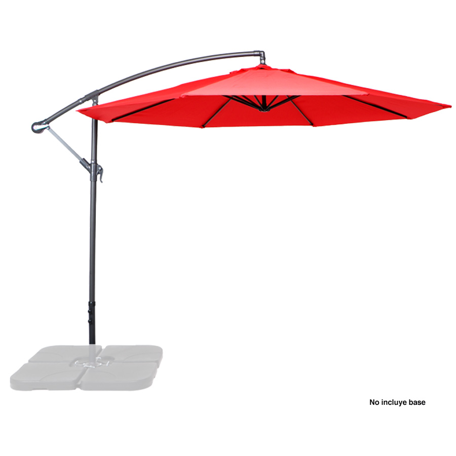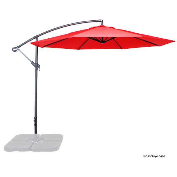 Quitasol colgante redondo de Ø3m, modelo «Banana», con 8 cascos de lona Poliéster UV impermeable de 160g. Contiene varas reforzadas de Acero recubierto de 12 x 18mm, asta de Acero recubierto de 48mm, sistema de apertura manual.