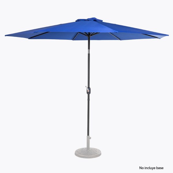 Quitasol redondo de Ø3m, modelo «Shake», con 8 cascos de lona Poliéster UV impermeable de 160g. Contiene varas reforzadas de Acero recubierto de 12 x 18mm, asta de Acero recubierto de 38mm, sistema de apertura automático con manivela y codo giratorio de 45°. No incluye base.