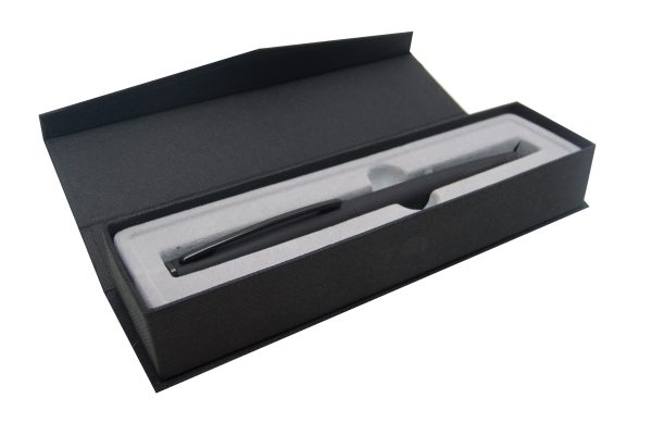Metal. Roller. Cuerpo de color negro mate, clip con detalles en color negro brillante. Tinta negra. Con estuche de cierre imantado. Destape electroplateado en la parte superior. Presentación en estuche con cierre magnético.