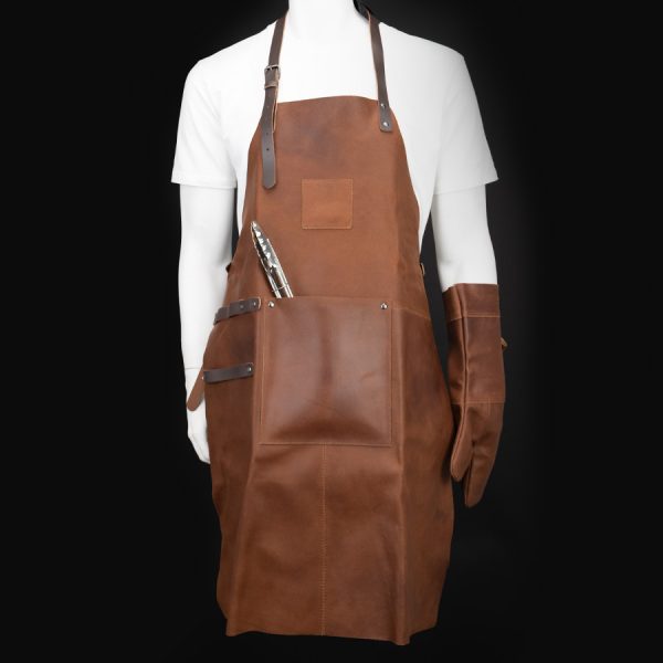 Un regalo fuera de serie. Deluxe set de Asador, contiene Pechera de Asador BBQ en Cuero tostado 100% genuino color café cognac, con cintas y porta-accesorios de Cuero 100% genuino color café oscuro. Remaches de acero envejecido y bolsillo delantero de 20.5 x 23 cm. Cuadrado para logo de 8 x 8 cm. Contiene además largo mitón de Asador BBQ en Cuero engamuzado 100% genuino color café cognac y tenazas de Acero inoxidable. Presentación en elegante caja de regalo de cartón negro con ventana de mica transparente y gráfica a todo color con descripción de los elementos del set.