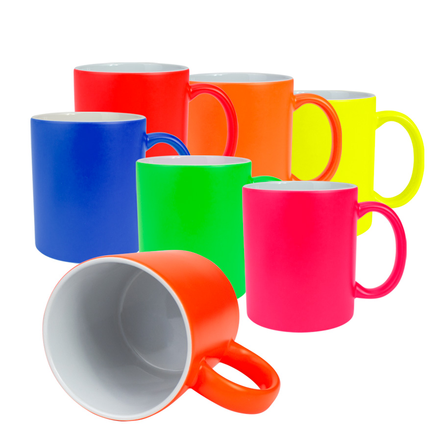 Tazón cerámico de 11oz (330 cc) con superficie exterior de color fluorescente, interior blanco, para Sublimación. Producto de calidad superior ORCA. Presentación en bolsa plástica translúcida + caja de cartón blanco.